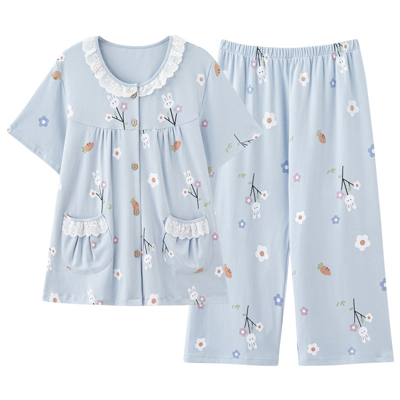 纯棉短袖 薄款 七分裤 2025年新款 家居服 圆领开衫 芬腾可安睡衣女夏季